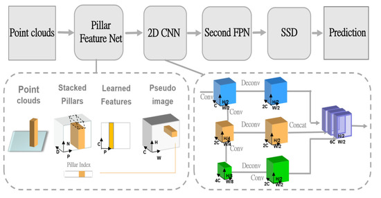 - Lang, A.H.; Vora, S.; Caesar, H.; Zhou, L.; Yang, J.; Beijbom, O. PointPillars: Fast encoders for object detection from point clouds. In Proceedings of the IEEE/CVF Conference on Computer Vision and Pattern Recognition, Long Beach, CA, USA, 16–20 June 2019; pp. 12697–12705. [Google Scholar]