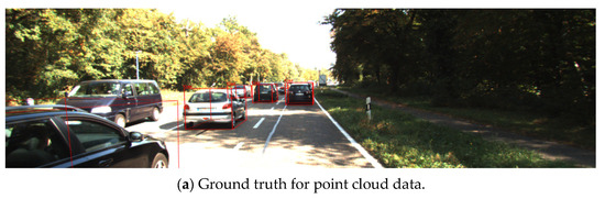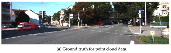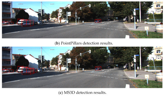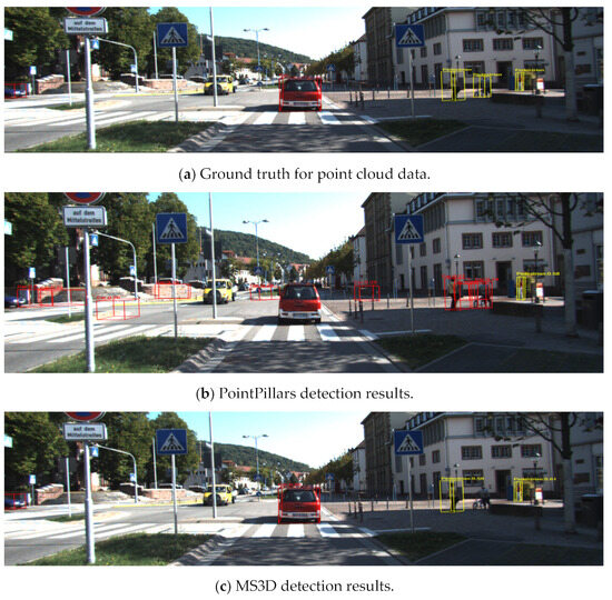 Due to PointPillars’ exceptional performance, ranking second among the evaluated algorithms, this section primarily presents a visual comparison between MS3D (our model) and PointPillars. Figure 5a, Figure 6a and Figure 7a represent the point cloud data labels.