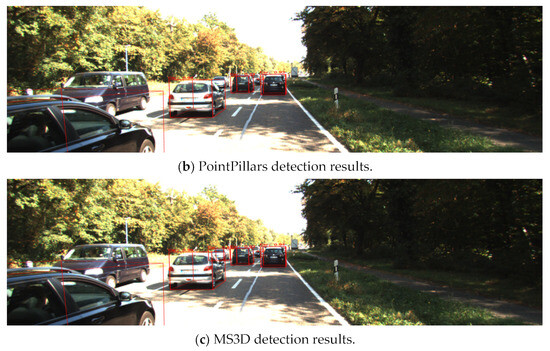 In contrast, MS3D effectively detects the fast-moving red car and the severely occluded blue car while minimizing false positives, as shown in Figure 7c. Leveraging SecondFPN’s multi-scale feature extraction and fusion capabilities, MS3D significantly enhances point cloud feature representation, enabling precise focus on critical features and accurate detection of partially visible targets. The incorporation of 2D convolutions improves the model’s interpretation of 2D projections from point cloud data, thereby enhancing detection performance for severely occluded and dynamically moving objects. Additionally, the Adam optimizer’s efficient parameter update strategy facilitates rapid convergence and high accuracy in complex scenes. Collectively, these advancements markedly improve MS3D’s performance in challenging and intricate environments.
