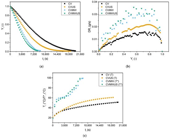 Evolution of dimensionless moisture content, Yi (a); drying rate, DRi (b); and temperature of the samples, T/T* (c), for each process.