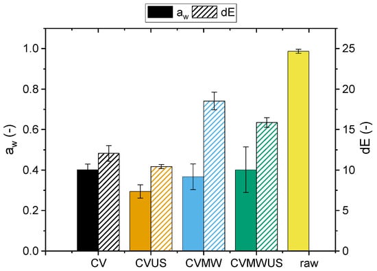 Average water activity, aw, and color difference index, dE, for each process.