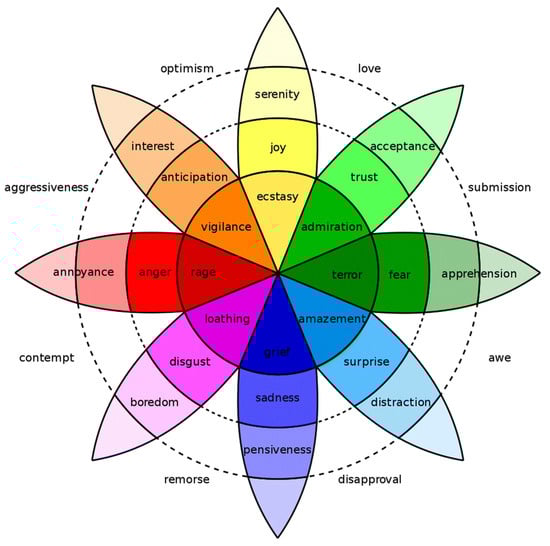- Plutchik, R. A General Psychoevolutionary Theory of Emotion. In Theories of Emotion; Plutchik, R., Kellerman, H., Eds.; Elsevier: Amsterdam, The Netherlands, 1980; pp. 3–33. [Google Scholar]
