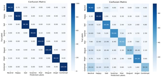 Due to the difficulty of objectively assessing the success of changing emotions in a photo, two emotion classifiers based on a neural network were trained. These classifiers have different overall accuracy; however, for individual cases, the classifier with lower overall accuracy can return the correct emotion as a result, while the theoretically more accurate classifier can classify emotions incorrectly in individual cases. Training more than one classifier increases the probability of correct emotion detection in the case of two different classifiers detecting the same emotion. The confusion matrices of the trained classifiers are presented in Figure 4.