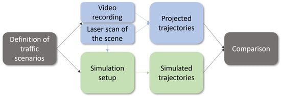 Validation of the presented simulation environments is a crucial step for reliable prediction. This is typically conducted via video recordings where trajectories are extracted for vehicles and other road users. Recorded trajectories can be extracted with the help of Machine Learning (ML)-based motion tracking methods. An overview of existing motion tracking methods is given in [14,15,16]. Instead of optical sensors, e.g., Light Detection and Ranging (LiDAR) sensors can be employed to record traffic scenarios in transportation infrastructure [17]. This was demonstrated to identify pedestrians that aim to cross a road (see e.g., [18,19]). LiDAR can also be employed in combination with optical sensors to record the street scene [20].