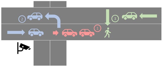 The three scenarios depicted on the T-junction. A car interferes with another road user, namely (1, red) a breaking car in front, (2, blue) a car in the LTAP maneuver, and (3, green) a crossing pedestrian. The camera position is also presented.