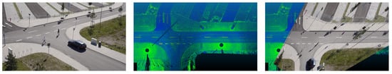 First, the scenarios were recorded with optical sensors. The camera position resulted in a view as shown on the left side of Figure 3. From the rooftop, it was not possible to film the scenery in a top view. Therefore, a laser scan of the T-junction was made; see Figure 3 in the middle. The image transformed by homography is shown on the right side of Figure 3.