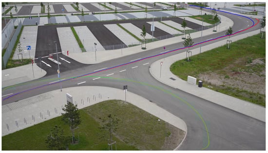 To record the movement of the traffic participants in the scenery, a full-frame Sony Alpha 7R (Sony Corporation, Bangkok, Thailand) camera with a fixed focal length lens (Sony FE35F1.8) was mounted on the roof of Fraunhofer IPM. From the rooftop, it was not possible to film the scenery in a top view; therefore, a laser scan of the T-junction was made. We filmed the different scenarios with a frame rate of 100 fps and an image size of 1920 × 1080 pixels to detect the trajectories. With the help of a laser scan and the homography, the images were projected onto the street plane.