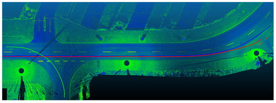For modeling the T-junction in OpenDrive, the geometry of the junction is needed. Therefore, we use a terrestrial laser scanner, the Leica RTC360 [29], to record the 3D geometry of the T-junction. Using a laser scanner has the advantage that the 3D geometry of the scenery is captured very detailed in less than half an hour. From the point cloud, the kerbs and the color markings are extracted. This serves as the basis for the modeling. With the extracted geometric properties of the T-junction, the OpenDrive file can be created.