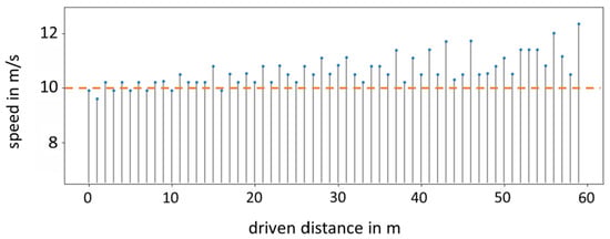 Visualization of the derived speed of a car from the recordings, depending on the distance traveled by the car. The actual velocity of the car, marked as a dotted orange line, is 35 km/h (9.72 m/s). The investigation of the car begins at x = 0 m and ends at x = 60 m. Consequently, the distance between the recording system (camera) and the investigated car also increases as the distance driven increases.