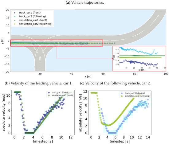 The velocities of the simulated and recorded vehicles show that driving behavior similar to the recorded trajectory can be achieved by the simulation. However, unlike the recorded vehicle, the simulated vehicle never comes to a complete stop. In addition, a temporal offset at the beginning of the curves can be observed. One contributing factor to the observed deviations is the reaction time, which is not appropriately set in the simulation software. The classical behavioral model, according to Krauß, considers a parameter for the reaction time as shown in Equation (1). Real values for reaction times are about 1 s to 2 s [35]. This corresponds approximately to the offset in time between the simulated and recorded curves. Further, the behavioral model without reaction time can avoid a collision at any time without coming to a stop for the distances in the scenario. This behavior is also justified by the low selected minimum distance of the reactor. However, larger minimum distances lead to even larger offsets of the curves in time in the simulation, which result from the lack of a realistic reaction time.