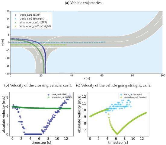 However, the progressions of the velocities present obvious deviations. Especially for car 1 in Figure 8b, a clear difference between simulation and recording can be observed. While in the recording the left-turning vehicle brakes and comes to a stop to let car 2 pass, the simulated car 1 hardly reduces its speed and performs its maneuver without the influence of car 2. It is clear that the behavioral models for lane change and vehicle following included in the simulation are not sufficient to represent such a scenario, as they only consider vehicles immediately next to or in front of them. However, the version of the simulation used does not yet include any functions to represent the observed behavior.
