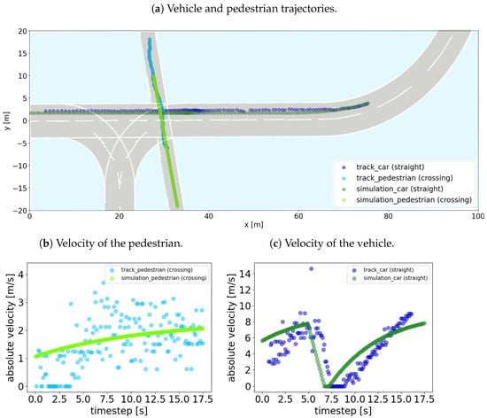 Due to the small cross-section of pedestrians in the videos, the tracking of these exhibits variation in the direction of movement and is orthogonal to it. This leads to extreme fluctuations in the calculation of the absolute velocity in each time step between 0 and 4.2 m/s, which can be seen in Figure 9b. As mentioned above, the derived velocity varies, so the velocity is smoothed using the median over 10 data points. Figure 9c shows the velocity profile of the vehicle in scenario 3. As in scenario 1, the time gap of about 1 s between the onset of braking in the simulation and the recorded trajectory can be observed in scenario 3. The lack of reaction time of the simulated agents leads to the earlier braking maneuver. The acceleration of the simulated car 1 decreases after stopping until reaching the desired velocity, while it seems to be linear in the real course. However, both courses are realistic.