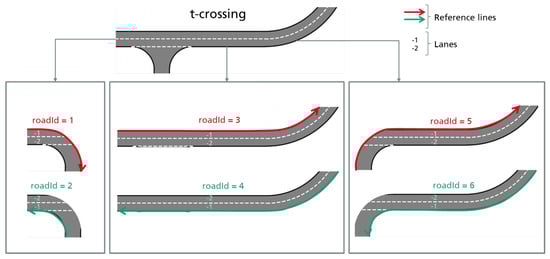 The idea is to define overlaying roads with different driving directions and no connectors on the crossing as they are defined in the standard. For all possible routes on the t-crossing from the start to the end of the route, a road with the corresponding reference line and two lanes according to the driving direction on the route is defined; see Figure 10. This realization defines an OpenDrive-based file that includes all possible driving directions on the T-junction, and respective openPASS simulations are able to interpret the scenario.