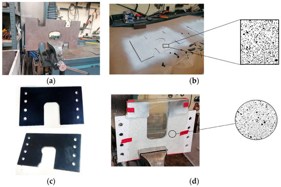 Getting test specimens ready. (a) Cutting and modeling of the double-bottom floor geometry, (b) surface preparation of the double-bottom floor, (c) cutting and modeling of the cutout no. 1 and no. 2 geometry, (d) surface preparation of the cutout no. 2.