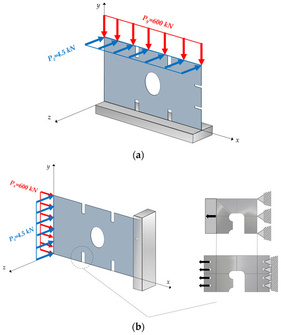 Loading scenarios and boundary conditions. (a) Initial configuration, (b) configuration adapted to the testing machine with an isolate model of the cutout.