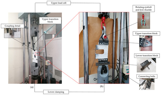 For the experimental evaluation of the floor plate, a two-phase modeling approach was developed combining two different center openings according to their orientation and geometric characteristics. In the first step, the specimen is fastened to the testing machine using a top transition piece in order to conduct a thorough examination of the double-bottom floor plate. This block is securely connected at the lower clamp and has a U-like component threaded on a cylindrical element to mimic the design load (Figure 6). In the second step, attention is focused on one of the apertures, specifically the longitudinal stiffener cutout. Test specimens related to this cutout geometry are positioned in the fatigue machine using two connection pieces (upper and lower). The loading scenarios and boundary conditions are established by these coupling blocks. The top transition piece is made up of two welded parts to compensate for potential machine and weld misalignments: a trapezoidal unit with a circular aperture to connect the lyre shackle and a rotating eyebolt, and a U shape that replicates the design load using bolts tested to generate a double shear force. The bottom transition block similarly consists of two welded sections with a parallelepiped element and is secured to the specimen with four bolts to give sufficient rigidity (Figure 6).