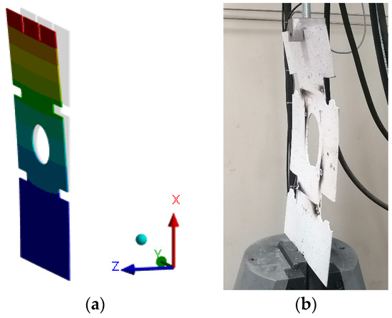 Difference between numerical and experimental regime. (a) Finite element analysis, (b) experimental test.