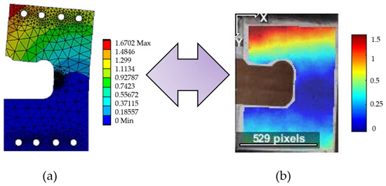 Following the methodology outlined by Kumar et al. [36], the second stage of validating the numerical model entails comparing numerical (FEM) and experimental results by correlating them using digital image correlation (DIC), through a Sony® HDR-XR500VE camcorder (Shanghai, China), with the 2D MATLAB® software Ncorr® v1.2 [37]. Under the given standard load circumstances, the maximum displacement varies by 7.1% (Figure 9).