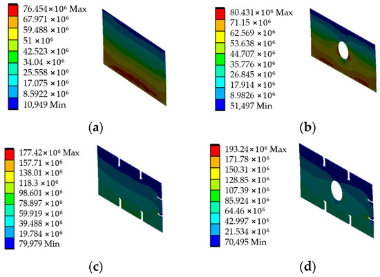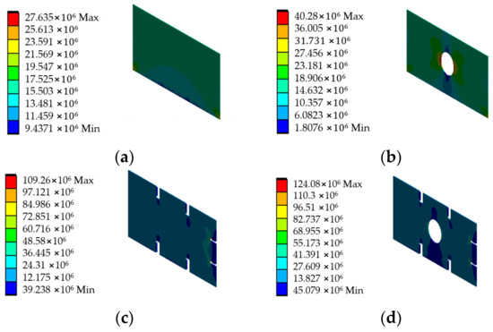 Von Mises stress distribution (Pa) with 14.5 mm thickness and axial load. (a) Solid plate, (b) plate with central opening, (c) plate with cutouts, (d) plate with central opening and cutouts.