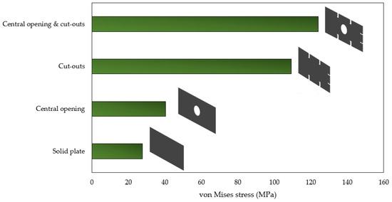 The double-bottom floor, under axial loading scenario and different geometrical conditions, shows a very significant variation of the stress distribution that represents the great influence of the openings present in the structural behavior of the same with respect to the initial condition of the solid plate, in terms of the increase of the maximum von Mises stress of 31.4%, 74.7%, and 77.7% with respect to the condition of the plate with central opening, plate with cutouts, and plate with central opening and cutouts, respectively. A great influence of the presence of the cutouts with respect to the central opening is observed, since there is a minimum difference of 3% of stress increase when all the geometrical discontinuities (central opening and cutouts) or only the cutouts are present (Figure 11).