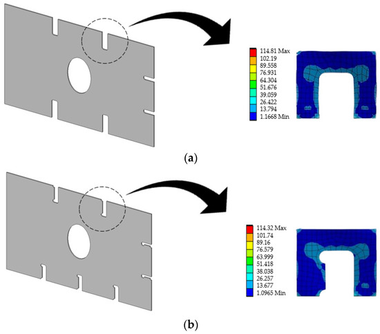 Distribution of Von Mises stress (MPa). (a) Cutout no. 1, (b) cutout no. 2.