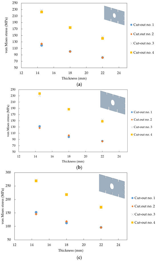 Von Mises maximum stress at modification of thickness. (a) Model no. 1, (b) model no. 3, (c) model no. 6.