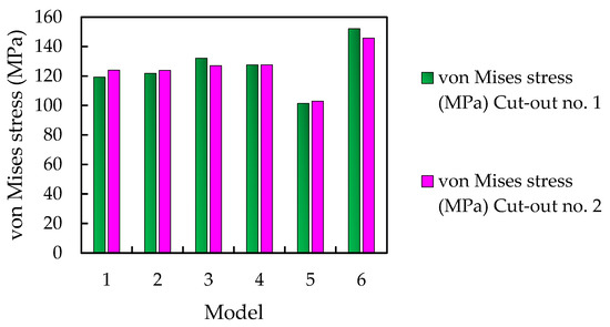 A common behavior is observed, whatever the model tested; the trend of the maximum von Mises stress decreases linearly with sequential increases in the thickness of the double-bottom floor, a behavior that can be extrapolated to determine the necessary increase in thickness to decrease the desired amount of von Mises stress. Regardless of the model, a clear improvement, translated into a lower stress level, is observed for cutouts no. 1 and no. 2 with respect to cutouts no. 3 and 4. The geometries relative to the double-bottom floor with the cutouts no. 1 and no. 2 present the biggest difference for the smallest thickness (14.5 mm) and of value 3.86, 3.76, and 4.16%, for the case of model no. 1, model no. 3, and model no. 6, respectively. Figure 16 shows the stress distribution as a function of the models at equal thickness (14.5 mm) and an axial loading scenario, for the case of cutout no. 1 and cutout no. 2.