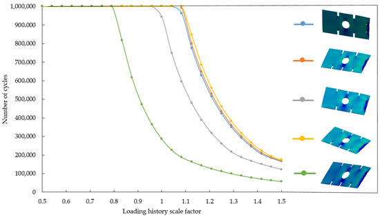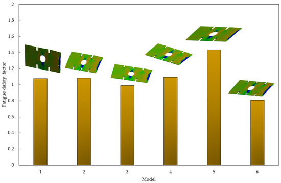 The fatigue safety factor (FSF) is represented as a contour plot showing the safety factor relative to fatigue failure over a specified design life (typically 1 × 10⁹ cycles) [38,39]. Figure 17 shows the minimum FSF for different combinations between models and cutout geometries.