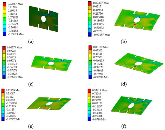 Biaxiality indication (BI) is defined as the ratio of the smaller principal stress to the larger principal stress, excluding the principal stress closest to zero from consideration [40]. A BI value of 0 indicates uniaxial stress, −1 represents pure shear, and 1 corresponds to a purely biaxial stress state. Figure 19 shows the distribution of BI for different cases.