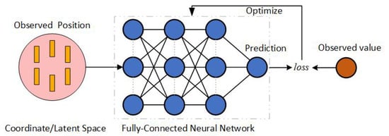 Implicit neural representation (INR), compared to GNNs, does not face the challenge of receptive fields, as seen in models like Neural Radiance Fields (NeRF) [15]; NeRF represent an entire scene implicitly by independently mapping the observation space to the pixel observations from different viewpoints. This learning process between sample points is independent. Figure 2 presents a schematic representation of INR. By utilizing key–value pairs of observation positions and observed values, INR establishes a mapping from spatial coordinates to observed value by using fully-connected neural networks [16]. This area of research has garnered significant attention recently. INRs are not limited to Euclidean spaces; they can also represent vector fields in latent spaces. This allows complex scenes to be embedded into a continuous latent space in a highly flexible manner, free from traditional discretization processes. The core of this approach lies in leveraging deep neural networks to learn and represent the details and structure of the observational data, rather than relying on predefined, fixed grids or voxel structures.