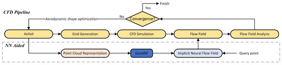 Figure 4 illustrates the process of airfoil optimization and the role of GeoANF within it. The CFD process begins with generating a mesh around the airfoil, followed by numerical simulations to solve for the flow field. Once the flow field is obtained, an aerodynamic performance analysis is conducted. The results of this analysis are then used to further optimize the airfoil shape until aerodynamic performance meets the requirements. In our approach, the airfoil is represented as a point cloud input to the GeoANF, which produces an implicit neural field. The flow field is then acquired by querying points within this neural field. The integration of neural networks (NN) facilitates the acceleration of CFD simulations.