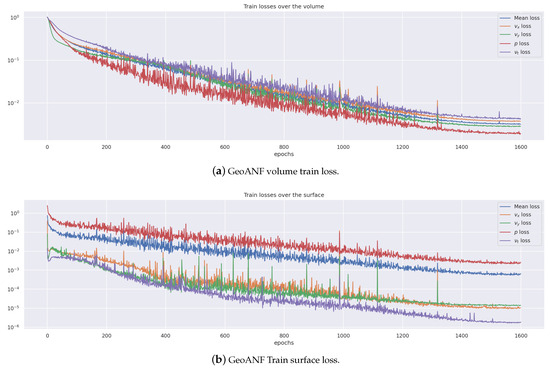 GeoANF model required approximately 1600 epochs to achieve convergence, as illustrated in Figure 8. As shown in Table 3, the convergence speed of the GeoANF model was slower relative to the baseline models, resulting in a total training duration of 20 h. This training length exceeded that of the baseline models, but the GeoANF model demonstrated significant advantages in prediction accuracy and forward propagation time, which will be shown in Section 3.3. Specifically, after completing model training, it could predict in a shorter duration while maintaining the same order of magnitude of model parameters as the baseline models.