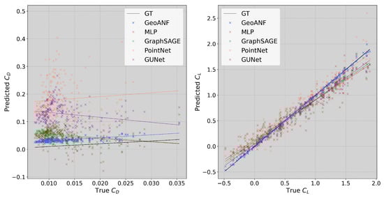 Figure 11 presents a visualization of the correlation between the lift and drag coefficients from CFD and the predicted surface pressure by various deep learning models, the GeoANF model achieves better outcomes in correlation evaluation metrics. With respect to the lift coefficient, the GeoANF model demonstrates a high degree of correlation with the CFD results.