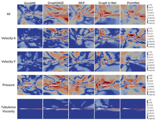 Since the values in most regions are relatively small, we applied a logarithmic scale to the color levels for visualization. Figure 12 presents a comparison of the normalized mean squared error (MSE) of each model relative to the actual flow field values. The visualization results from the first to the fifth row sequentially represent the overall error, error of velocity-x, error of velocity-y, error of pressure, and error of turbulent viscosity. The GeoANF model has shown advantages over other baseline models across all listed evaluation metrics.