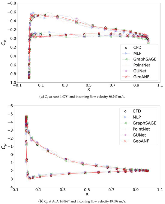 As illustrated in Figure 13, we present the visualization results of the boundary pressure coefficients for two cases. The inflow velocities for the first and second images are 80.247 and 49.099 m per second (m/s), respectively, with angles of attack of 1.078 and 14.068 degrees, respectively. GeoANF demonstrates the best alignment with CFD results in terms of result. Nevertheless, GeoANF remains the best-performing model among them. However, it can be observed that Figure 13 first images, at the tail end of the airfoil, the results from all deep learning methods fail to predict accurately.