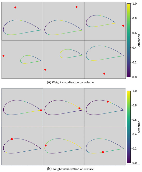 The normalized weight distribution situation for query points located on the airfoil surface, as shown in Figure 14b. Comparatively, when query points are on the surface of the airfoil, similar to when they are in the volume flow field, the weights vary with the change in query position. However, when query points are on the boundary of the airfoil, the variation in weights is relatively more pronounced. When the point moves counterclockwise at the tail of the airfoil, we observe a significant change in weights, as shown in Figure 14b, in the first row of the first two images. When the point is on the underside of the tail airfoil, the weight at the tail end of the airfoil’s underside is greater. When the query point shifts to the upper surface, there is a significant change in the weight distribution on the underside.