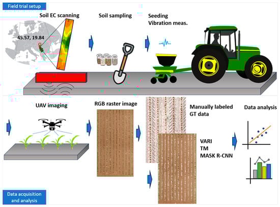 The field trial was performed in 2021 in the northern part of the Republic of Serbia (geographic location: 45°34′24.67″ N, 19°50′36.72″ E). To enhance the understanding of the experiment, the flowchart is presented in Figure 1. The trial field encompassed a 0.53 ha area that was traditionally cultivated using the wheat–maize–soybean crop rotation. The field was characterized as being flat with minimal variations in elevation or slope.