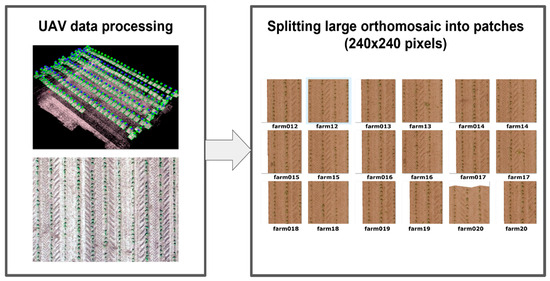 The pipeline of the UAV orthomosaic creation followed by its patch-based division procedure.