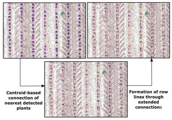 Plant spacing estimation from detected corn plants with the used methods requires the identification of rows. This was accomplished by connecting adjacent plants within the rows represented through the centroids of the nearest detected connected components. If the distance between the nearest connected components exceeded 75 cm (interrow space), the connection to the nearest remaining plant was skipped. Consequently, polylines were formed within the rows, linking nearby plants. These polylines were extended until they intersected with the nearest line. Connected polylines present the row lines and serve to ensure accurate plant detection. The row lines were intersected with the prior plant-detected positions, which filter out plants located within interrow spacing (Figure 3). We further analyzed created polylines to identify plant spacings.