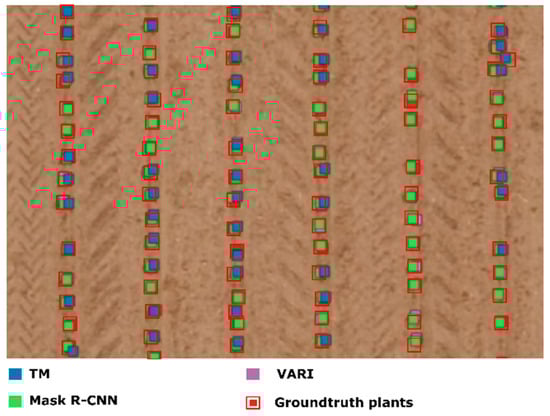 Unsatisfactory results with VARI-based and TM methods are caused by falsely detecting weeds and grassland as corn plants. This misclassification undermines the reliability and usefulness of the VARI index, as it fails to provide an accurate representation of the distribution and density of the corn plants. Secondly, the unsupervised segmentation of the VARI-based method heavily relied on the greenness of plants and faced difficulties in accurately detecting smaller plants within the field. Consequently, the challenge of establishing an appropriate threshold that would enable the precise detection of plants of all sizes proved to be a complex and demanding task, even if high-resolution RGB images were provided. On the other hand, the main drawback of the template matching approach is the high computational complexity, especially in scenarios where a comprehensive analysis of a large number of plants is required, such as in this study. The Mask R-CNN model is trained using two classes: corn plant and non-corn plant objects, which encompass various elements such as weed plants, rocks, and machinery marks in the soil.