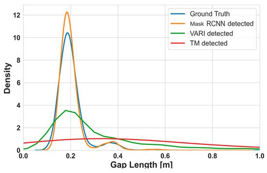 In Figure 5, the estimated distribution of plant spacings inferred from considered methods for plant detection is illustrated. The distributions of estimated plant spacings extracted from TM and VARI-based plant detection methods indicate a wide range of distances, with a relatively high proportion of spacings outside the expected distance range. In the case of Mask R-CNN plant detections, the estimated distribution of extracted spacings among plants is the most similar to the actual values indicated by the ground truth (GT).