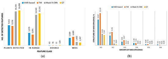 Comparative effectiveness of various plant detection techniques using GT data as reference values: (a) absolute values included and the proportion of mis-spaced plants in the overall population (b).