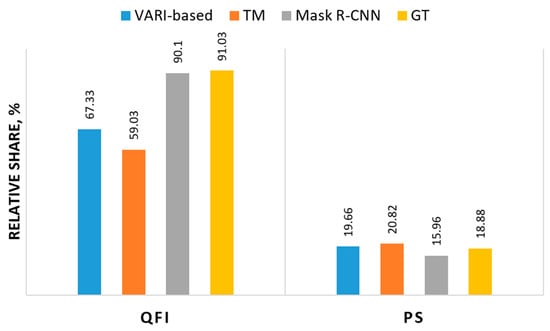 Mask R-CNN had the highest number of true positives (16,156), indicating it correctly identifies the most actual instances, and the lowest number of false positives (135), suggesting it rarely misidentifies an instance that is not actually present. On the other side, it has the highest number of true negatives (916), suggesting it correctly identifies negative instances more frequently, and the lowest number of false negatives (500), indicating it misses fewer positive instances. VARI shows a moderate number of true positives (9611), meaning it correctly identifies a significant but smaller number of instances compared to Mask R-CNN, but has the highest number of false positives (1505) and the lowest number of true negatives (74), suggesting it has the highest rate of inaccuracy. TM has the lowest number of true positives (9265), indicating it correctly identifies the lowest number of actual instances among the three methods. The number of false positives (900) indicates it makes some incorrect positive identifications, and the highest number of false negatives suggests that it misses a significant number of positive instances, which could impact its overall effectiveness. A visual representation of detection results for all three methods on the test patch is given in Figure 4.