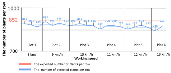 An analysis of seeding row unit vibration was performed to assess and quantify its effect on seeding quality. Additionally, the Mask R-CNN data and vibration parameters were analyzed in relation to working speed to validate the reliability of the machine learning method for specific applications. As seen in Figure 8, the results suggest that varying seeding velocities influence the frequency of gaps in the plant population, reducing the plant population, which supports the results obtained by Quanwei et al. [48] and Badua et al. [49]. There has been a slight drop in the number of identified plants as the working speed increased.