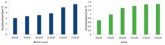 From Figure 9, it is clear that the vibration amplitude of the seeding row unit gradually increased as the working speed of the seeder reached 13 km/h. When the working speed was increased from 8 to 10 km h−1, the RMS (root mean square) parameter indicated an increase in vibration energy. However, further speed increases did not significantly affect the vibration’s energy. The interaction between the seeder structure and the soil layer resulted in distinct vibration characteristics at a particular working speed. When the speed reached 10 km h−1, additional frequencies that could be excited dampened the main vibration components that speed could enhance. Looking forward at Figure 10, the major frequencies, as well as vibration amplitude, can be noted for specific working speeds.