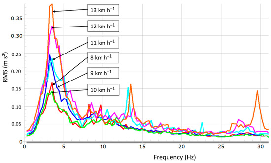 The most prominent features are the spectral densities within the frequency range of 0 to 7 Hz. Two more frequencies have noticeable amplitudes (12–15 Hz for 13 and 11 km h−1 and 28–30 Hz for 13 km h−1). The highest vibration energy was detected at a speed of 13 km h−1, followed by vibration at 12 km h−1. Working speeds of 9 and 11 km h−1 produced similar vibration amplitudes as well as 8 and 10 km h−1.