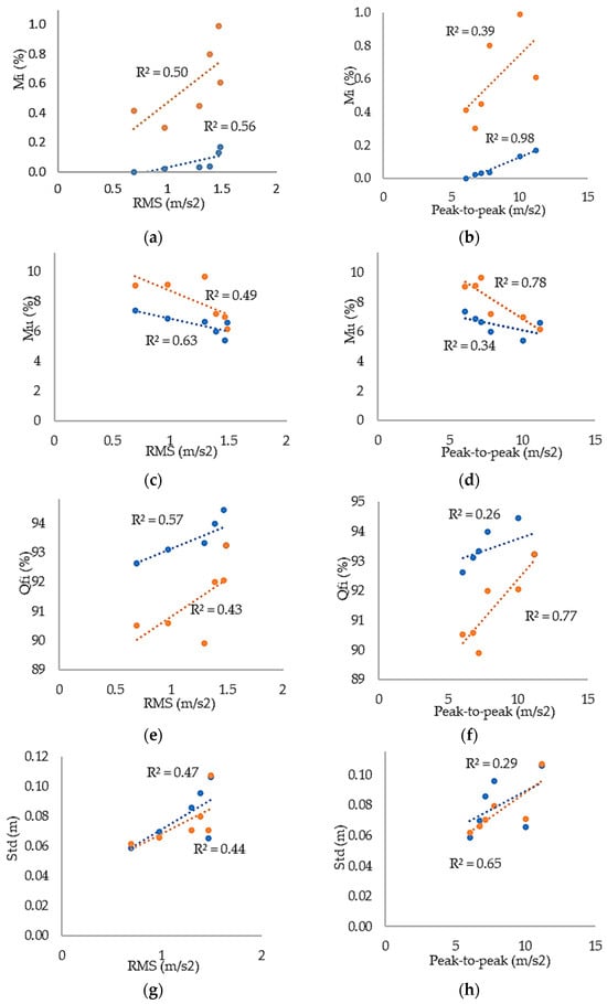 The relationship between vibration parameters of the seeding row unit and seeding quality parameters for the ground-truth data (orange dots) and for the Mask R-CNN data (blue dots): RMS compared to Miss index (a), Multiple index (c), quality of feed index (e), and standard deviation (g) and peak-to-peak compared to the Miss index (b), Multiple index (d), quality of feed index (f), and standard deviation (h).