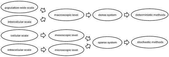 Intracellular and cellular processes form microscopic and mesoscopic systems, respectively, that consist of a relatively low number of biological components and can, therefore, be described as sparse biological systems. Due to their inherent randomness, these processes are best investigated using stochastic methods. In contrast, intercellular and population-wide processes are macroscopic systems represented by a crowd of biological components and, therefore, are characterized by high density. Deterministic models are most suitable for modeling these macroscopic systems. Figure 1 illustrates how the spatial scale and density analysis of biological systems discussed previously affects the selection of modeling methods.