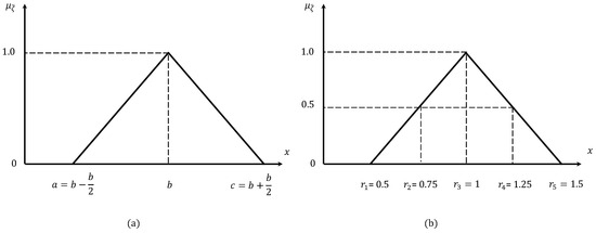 Here is an explanation of how we determine a TFN for the reaction rates, which is also illustrated in Figure 3. We always have qualitative knowledge on reaction rates at our disposal, such as translation being almost ten times slower than transcription. First, based on existing qualitative knowledge, we normalize the crisp value of a reaction rate b relative to the transcription rate, which is set to 1. During the validation stage of the model, we fine-tune the reaction rates by adjusting those of the corresponding transcriptions. Once these two stages are completed, the reaction rate is considered acceptable yieldings ; otherwise, . Next, we define the TFN, , of “acceptable rates” for each reaction by assigning a degree of membership to each rate value x, where . Notably, increases with x in the interval and decreases in the interval . In this research and .