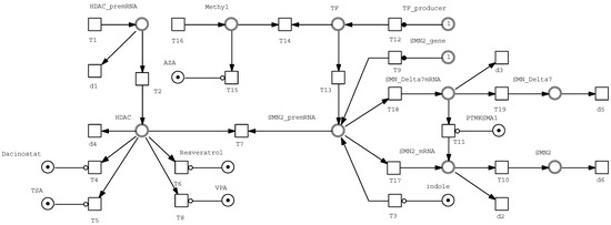 Petri net model of drug-disease network of SMN synthesis from SMN2.